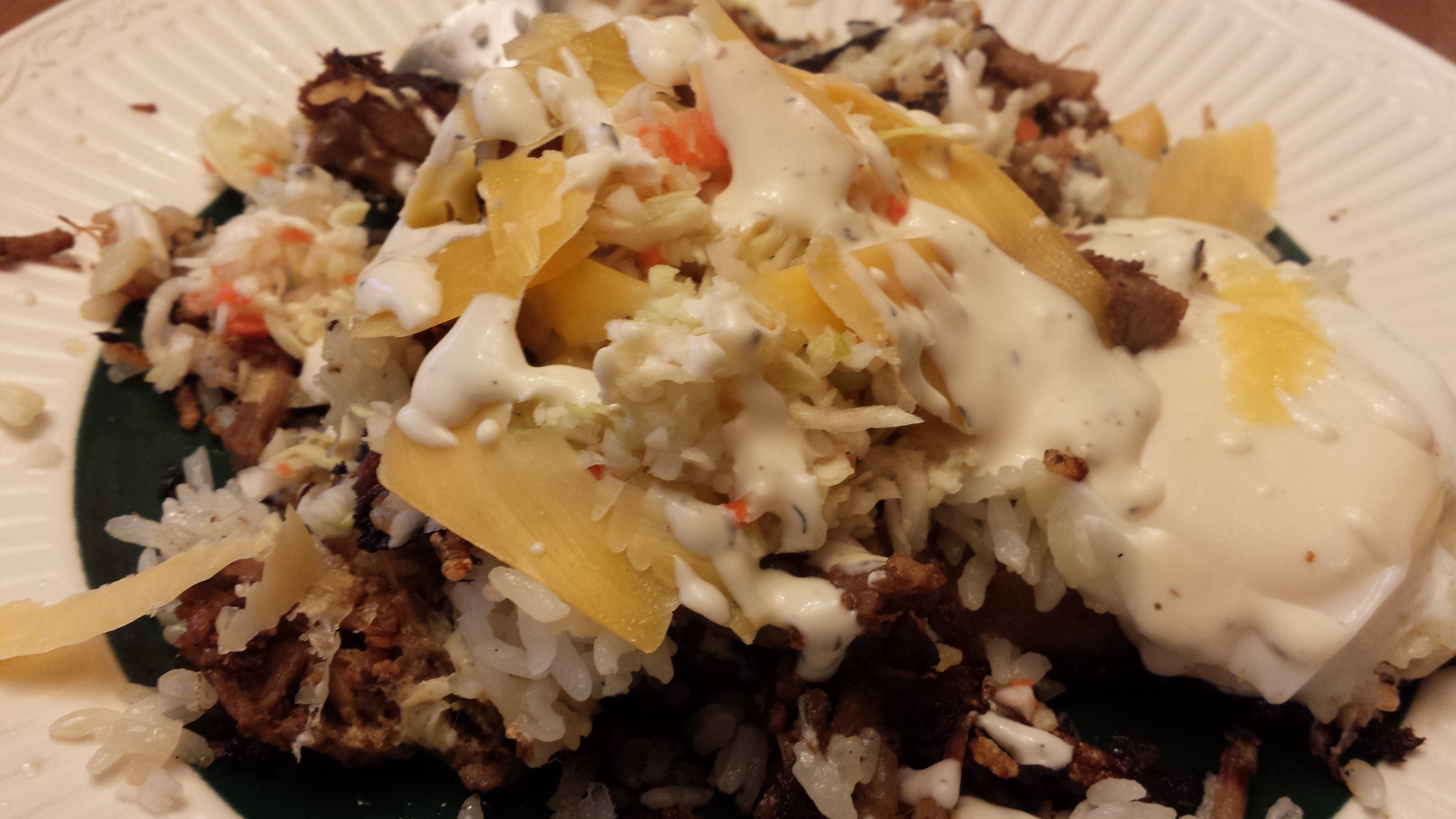 Plate the cook, add your coleslaw on top, grate some cheese and add your sauce of choice. I like ranch dressing. Add a bit of salt and pepper and you are ready to eat!