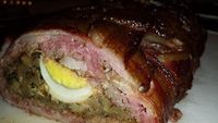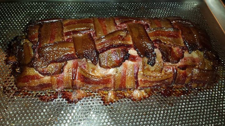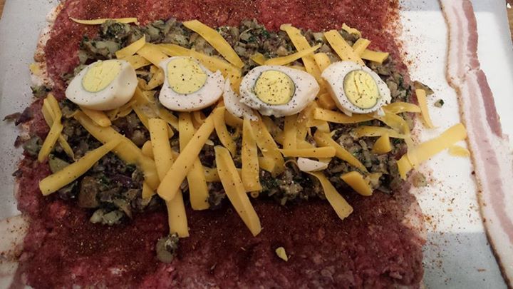 I prepared the bacon first on wax paper and then topped it with the rest of the ingredients. Once this was stacked, I rolled the bacon around to form a loaf and the ready to cook "Fatty". This went on my smoker grill... using the Bull Rack System with a drip pan below for about 4 hours +/-. The temperature started at 180 and then finished off at 425.